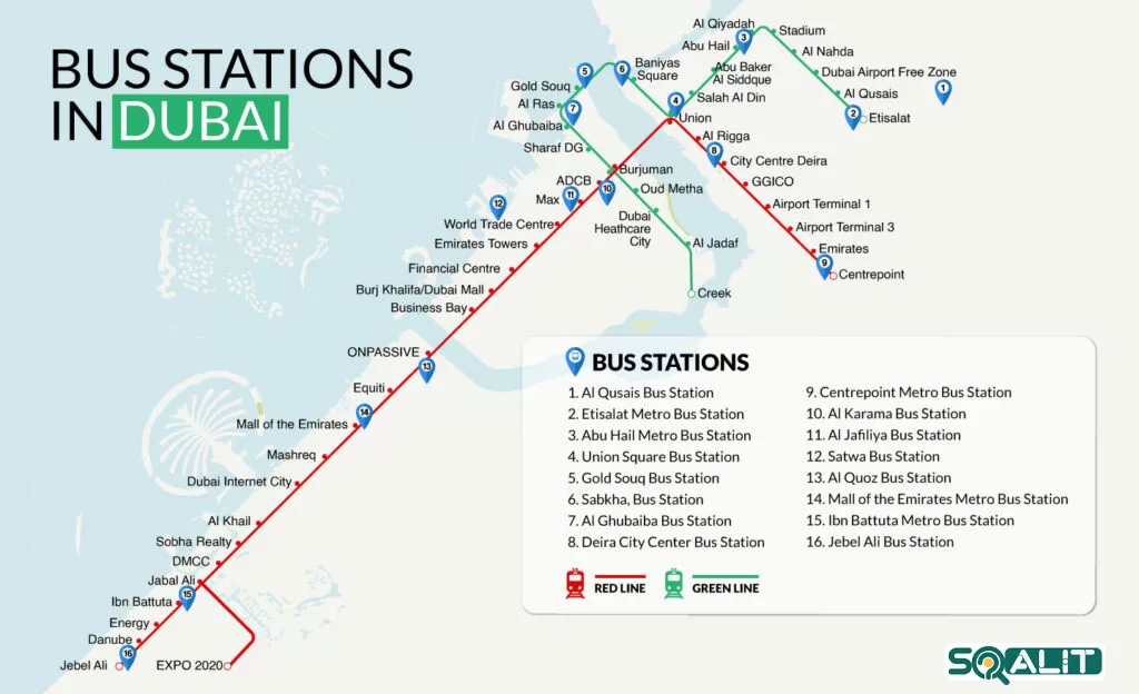 دو ایستگاه اصلی اتوبوس دبی، الغبیبه و گلد سوق هستند. شما میتوانید ایستگاههای اتوبوس را در سرتاسر دبی، حتی خارج از ایستگاههای مترو پیدا کنید.