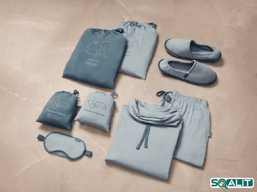 اگر در کلاس بیزینس پرواز میکنید و پروازی دارید که بیش از 9 ساعت طول میکشد، لباسی راحتی در اختیار شما قرار خواهد گرفت. این لباسخواب شامل یک تاپ یقهای و شلوار بند کشی، دمپایی راحت و یک ماسک چشم همسان است. اگر پروازی دارید که حداقل ۲ ساعت و ۳۰ دقیقه یا بیشتر است، دمپایی و ماسک چشم را رایگان دریافت خواهید کرد.