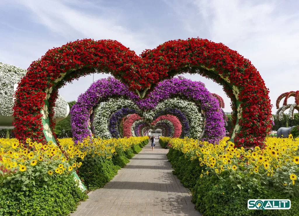 در مسیر قلبی شکل یا در میان قلعههای گلبرگ پرسه بزنید. شما میتوانید خود را در میان بیش از 150 میلیون گل شکوفه با جاذبههای فراوان و تنوع عظیمی از چیدمانهای عجیب و غریب، در این باغ غوطهور کنید.