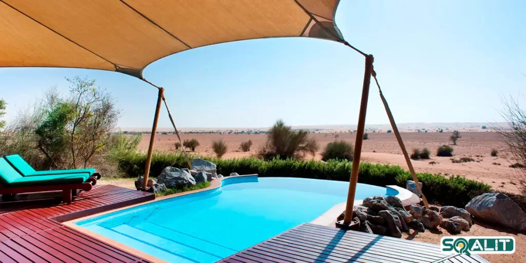 در استراحتگاه و اسپای صحرای ال ماها در منطقه حفاظت شده صحرای دبی، ویلاهای لوکس به سبک چادری وجود دارد که هرکدام دارای استخر بینهایت خصوصی هستند. شما میتوانید در این استراحتگاه از شترسواری در غروب آفتاب بر فراز تپههای شنی نیز استفاده کنید. ویلایی مشرف به یکی از واحههای طبیعی را بخواهید، جایی که میتوانید غزالها و اوریکس عربی را در هنگام صرف نوشیدنی تماشا کنید.